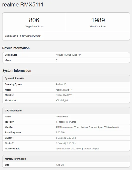 در قلب realmi 15T 5G، پردازنده‌ی مدیاتک دیمنسیتی ۶۴۰۰ قرار دارد که عملکرد بسیار خوبی را ارائه می‌دهد. این پردازنده با شش هسته‌ی ۲ گیگاهرتزی و دو هسته‌ی ۲.۵ گیگاهرتزی، قادر است بارهای پردازشی سنگین را به راحتی مدیریت کند. همچنین وجود گرافیک Mali-G57 MC2 توانایی‌های گرافیکی این گوشی را به طرز چشمگیری افزایش می‌دهد. بر اساس نتایج بنچمارک، این گوشی موفق به کسب امتیاز ۸۰۶ در بخش تک‌هسته‌ای و ۱,۹۸۹ در بخش چند‌هسته‌ای شده است که نشان‌دهنده‌ی قدرت پردازش بالا و قابلیت‌های مناسب آن در انجام کارهای روزمره و بازی‌های سنگین است.