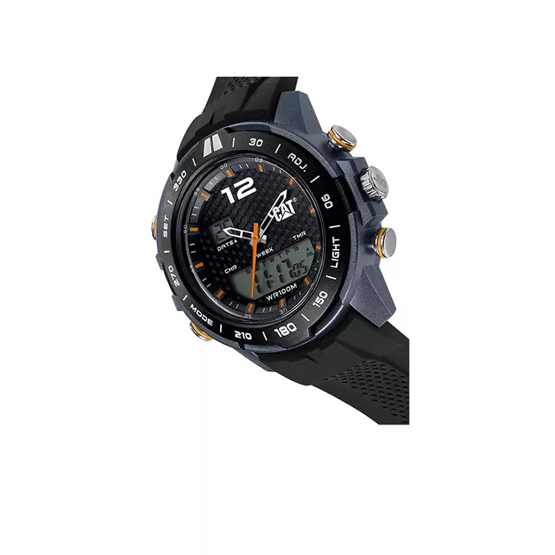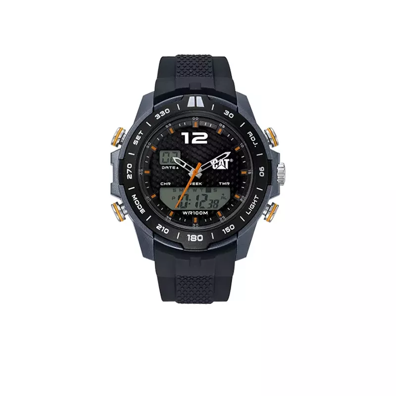 طراحی ساعت آنالوگ-دیجیتال CATERPILLAR MH.155.21.138 کاملاً در راستای هویت صنعتی و اسپرت این برند انجام شده است. رنگ مشکی یکدست در قاب، صفحه و بند ساعت، ظاهری قدرتمند، حرفهای و مدرن به آن بخشیده است.