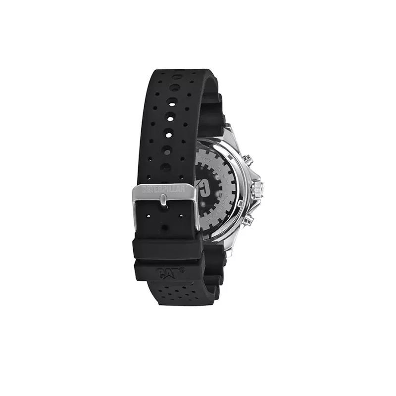 ساعت کاترپیلار مدل PZ.149.21.128 از نظر طراحی، کاملاً وفادار به هویت صنعتی و اسپرت برند کاترپیلار است. قاب ساعت با قطر 44.5 میلیمتر و ضخامت 12 میلیمتر، ابعادی متعادل و خوشفرم دارد که بهخوبی روی مچ دست قرار میگیرد و جلوهای قدرتمند اما نه بیش از حد بزرگ ایجاد میکند. شکل قاب گرد بوده و طراحی آن برای استفاده طولانیمدت بسیار مناسب است.